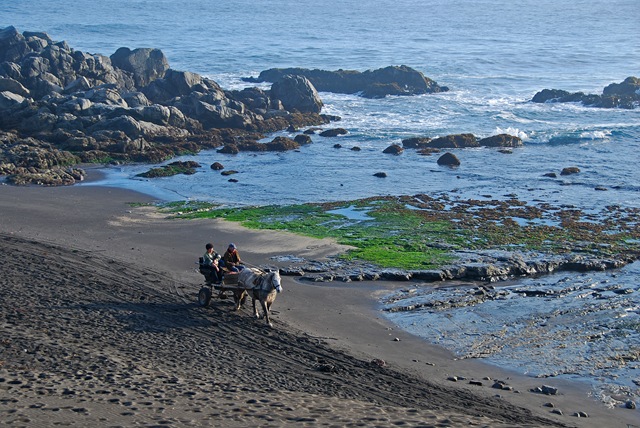 No encontré a nadie en la habitación y me senté en una roca para descansar contemplando la hermosura del inmenso Océano Pacífico que tenía a mi vista. Veía un senderito que serpenteando llegaba desde allí hasta la playa. Observé que un hombre y una mujer, con sus quiños (bolsones de malla para mariscar), a la espalda ascendían por el sendero, seguro pensé eran los dueños de la habitación y allí estuve hasta su llegada. ¡Los estaba esperando, les dije! Quería conocerlos. Se desprendieron de sus cargamentos y se acercaron. ¡Soy Pedro Encarnación y ella es mi mujer, La Negra Tomaza! Y yo me llamo Sergio, soy hijo de don José Jesús Sepúlveda. ¡Ah ya!, conozco mucho a su papá le estuve trabajando cuando sembraba arvejas aquí en la Centinela. Ambos eran de una edad calculada entre 30 a 40 años, rubios oscuros quemados por el sol y el aire marino. No habían perdido el color celeste de sus ojos y las formas de sus cabezas eran como pavachas, (trompos recortados), seguro que descendientes de náufragos holandeses que hubo en esa zona. Esa mujer pulida, habría sido una belleza y el hombre acicalado, un bonito ejemplar de varón.