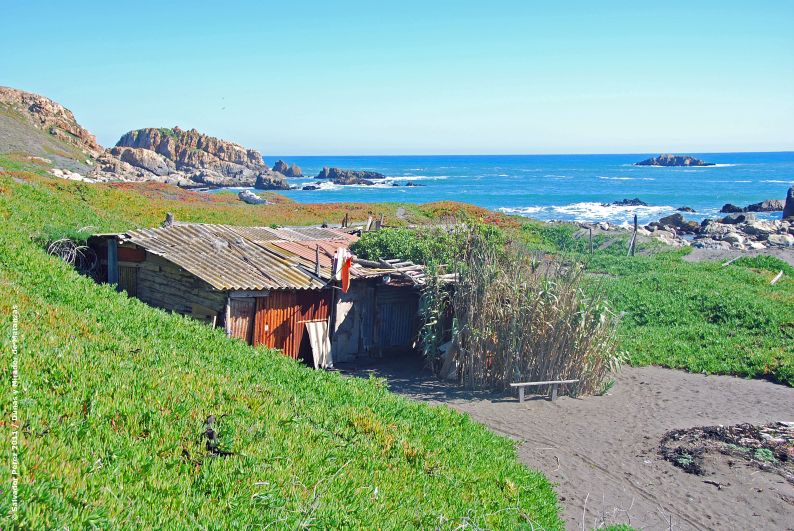 Salí de madrugada con un hermoso amanecer y después de unas 3 horas de haber andado por los cerros y colinas ubicados al sur y ocaso de mi Aldea, dirigí los pasos hacia el mar para refrescar el cansancio, con ese aire tan puro, fresco y agradablemente oxigenado. De bajada hacia el océano, fui a dar con una chocita emplazada a mitad de la cumbre. Era un armazón de estacas firmemente enterradas, mientras que el techo y los costados, (excepto el que daba hacia el mar), estaban envarillados. Esta estructura había sido forrada con largos cadejos y atados de paja trome, además ramas de eucaliptos amarradas al conjunto con alambres de fardos, quedando así resistentes a las fuertes embestidas del viento en aquel lugar. El lado descubierto, quedaba orientado para donde se producía la puesta del sol, ahí tenía una cortina de sacos muy bien unidos, adaptada para cubrir todo el vano de acceso de lado a lado. Al costado sur, se adosaba una ramada para secar pescado, cochayuyo y charqui de cabrito o de cordero lechón.
