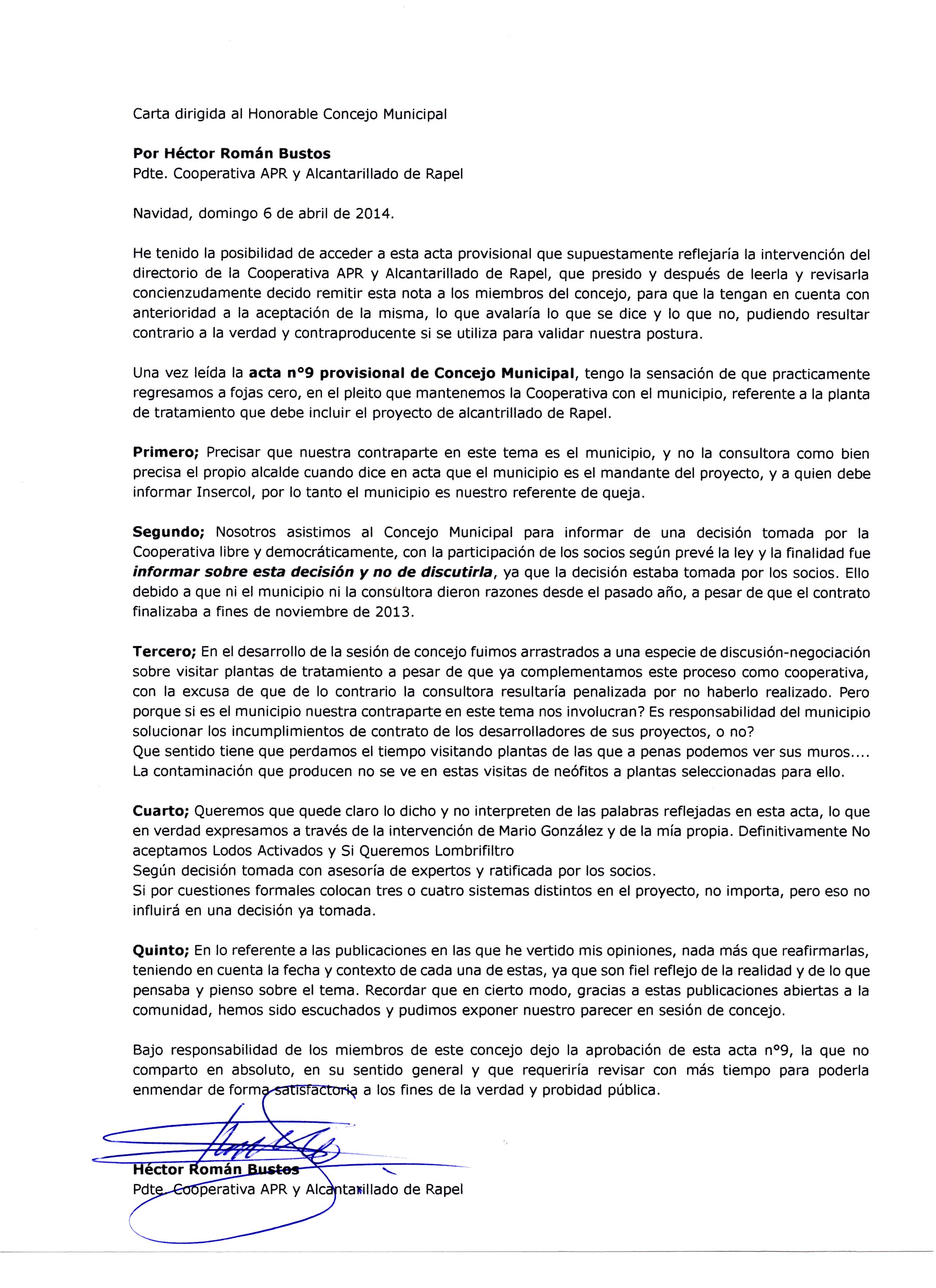 Quiero comenzar esta entrevista enunciando a los componentes del Consejo de administracion de la Cooperativa de Agua Potable y Alcantarillado de Rapel los que desde abril de 2013 tomamos las riendas Los miembros somos; Mario González como Secretario; Héctor Gómez como Vicepresidente y Segundo Hernández y Juan Acevedo como directores y quien habla Héctor Román como Presidente;