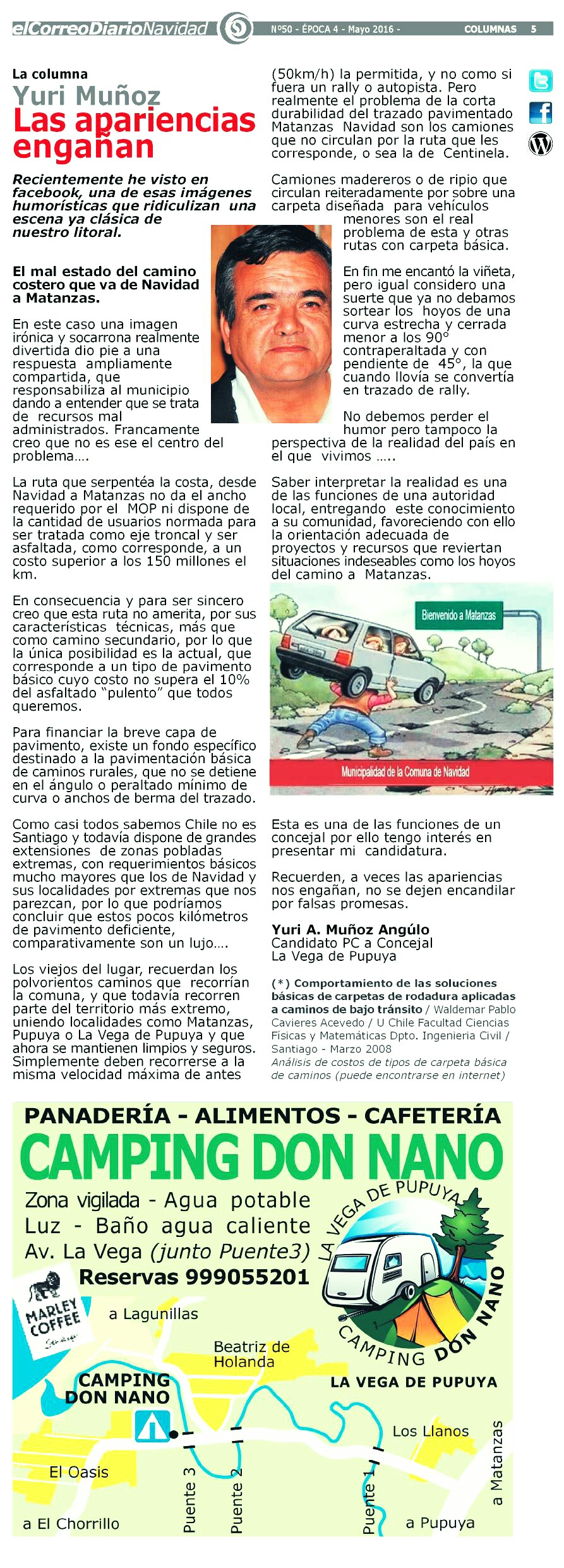 Como casi todos sabemos Chile no es Santiago y todavía dispone de grandes extensiones de zonas pobladas extremas, con requerimientos básicos mucho mayores que los de Navidad y sus localidades por extremas que nos parezcan, por lo que podríamos concluir que estos pocos kilómetros de pavimento deficiente, comparativamente son un lujo….