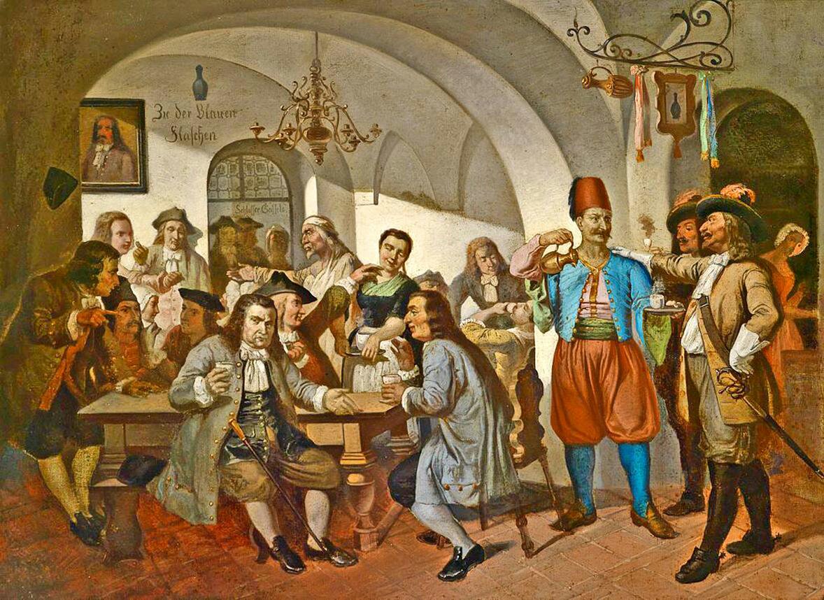 El polaco Franz Georg Colchitzk, militar destacado en la liberación de la ciudad, recibió también la licencia, decidiendo abrir (1706) la famosa cafetería, “La Botella azul”. Como novedad y para satisfacer la demanda matinal, junto al café, ofreció un “hojaldre” dulce y para aliviar la amargura característica del café turco, añadió, leche caliente.