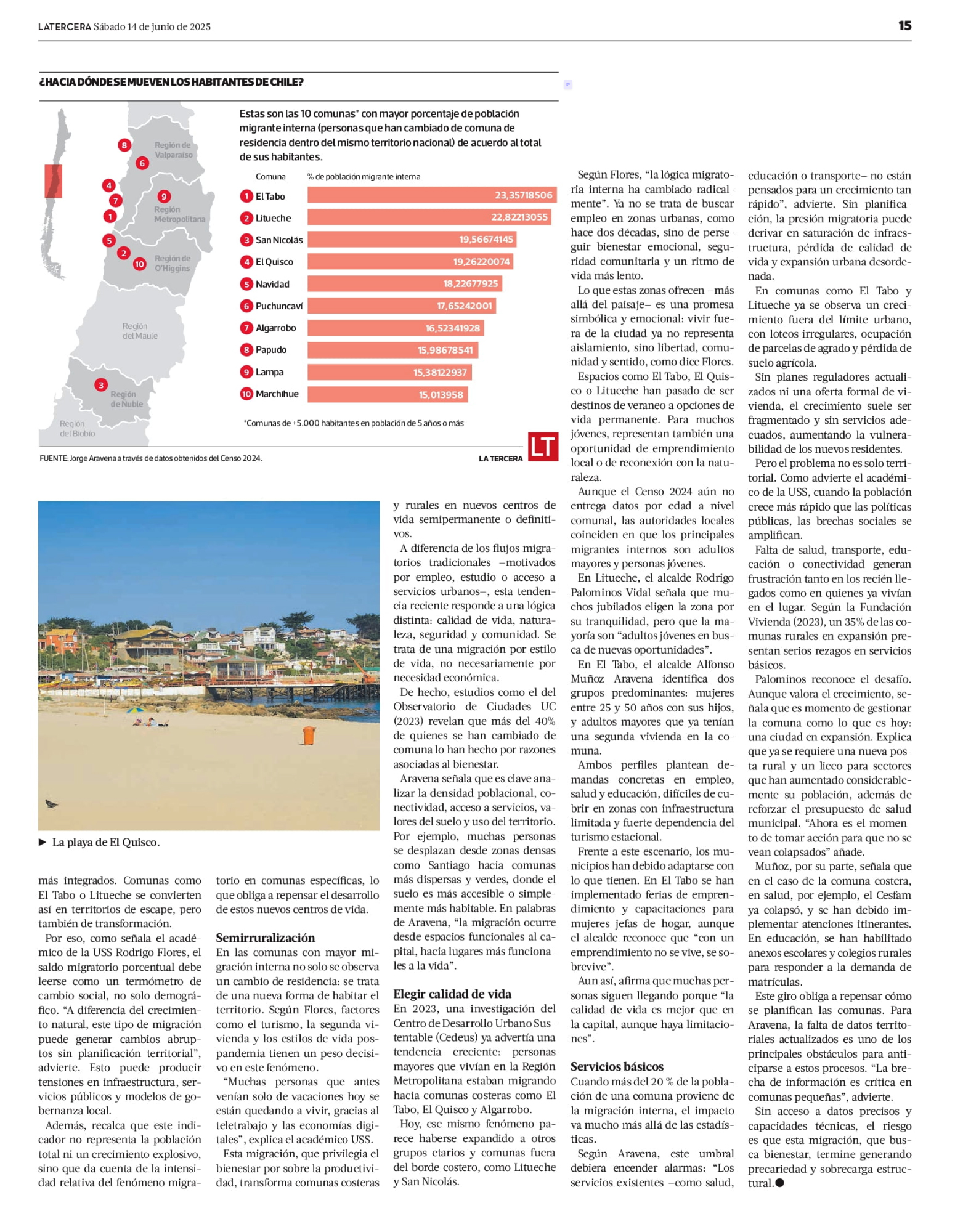 A juicio del geógrafo y analista del Centro de Inteligencia Territorial (CIT-UAI), Jorge Aravena, el saldo migratorio porcentual es más que una cifra: es un reflejo de presiones demográficas concretas sobre comunas que históricamente han sído pequeñas y rurales.